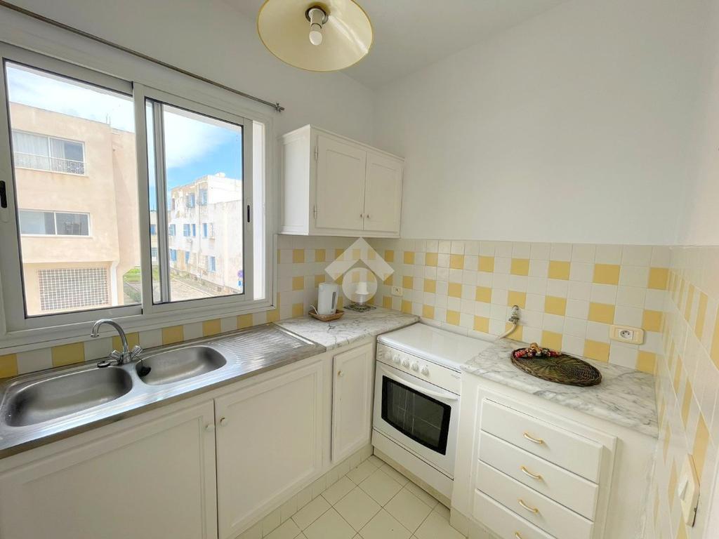 La cuisine est agencée et équipée par des éléments de rangements, une cuisinière, une machine à laver et un réfrigérateur.