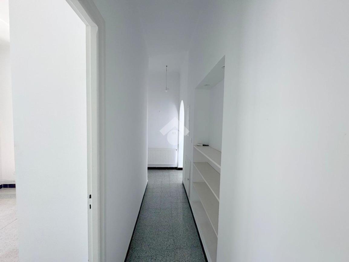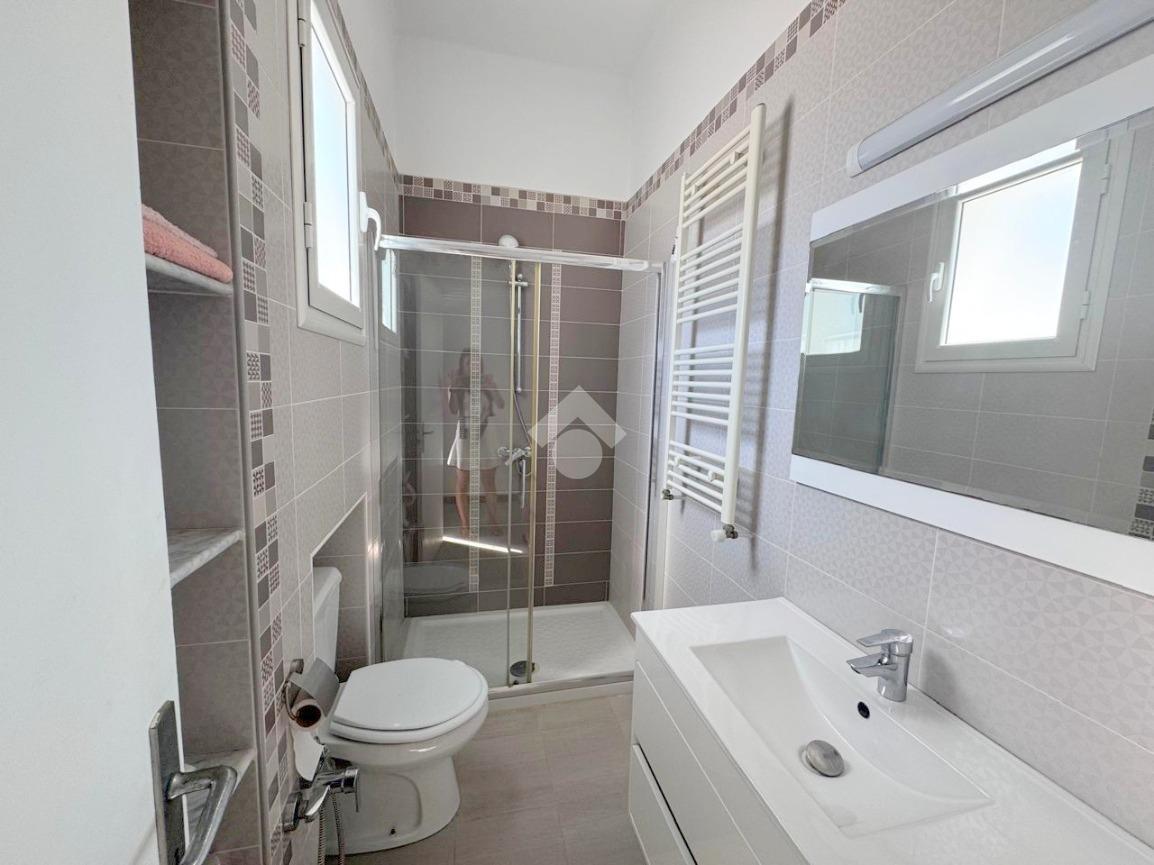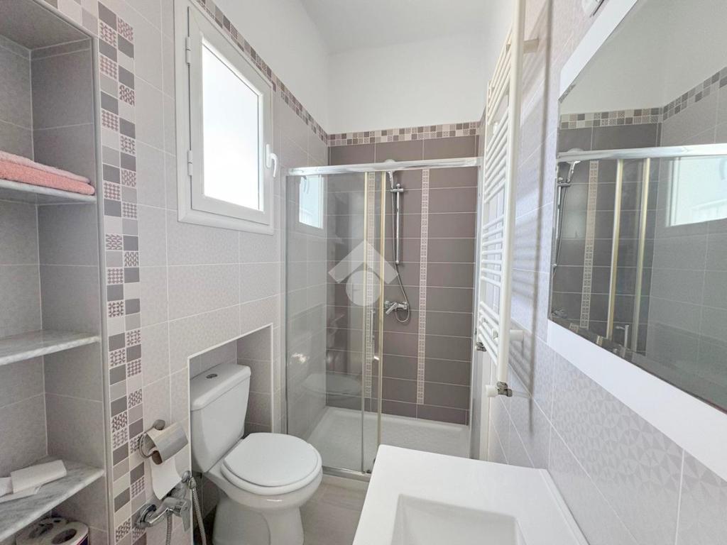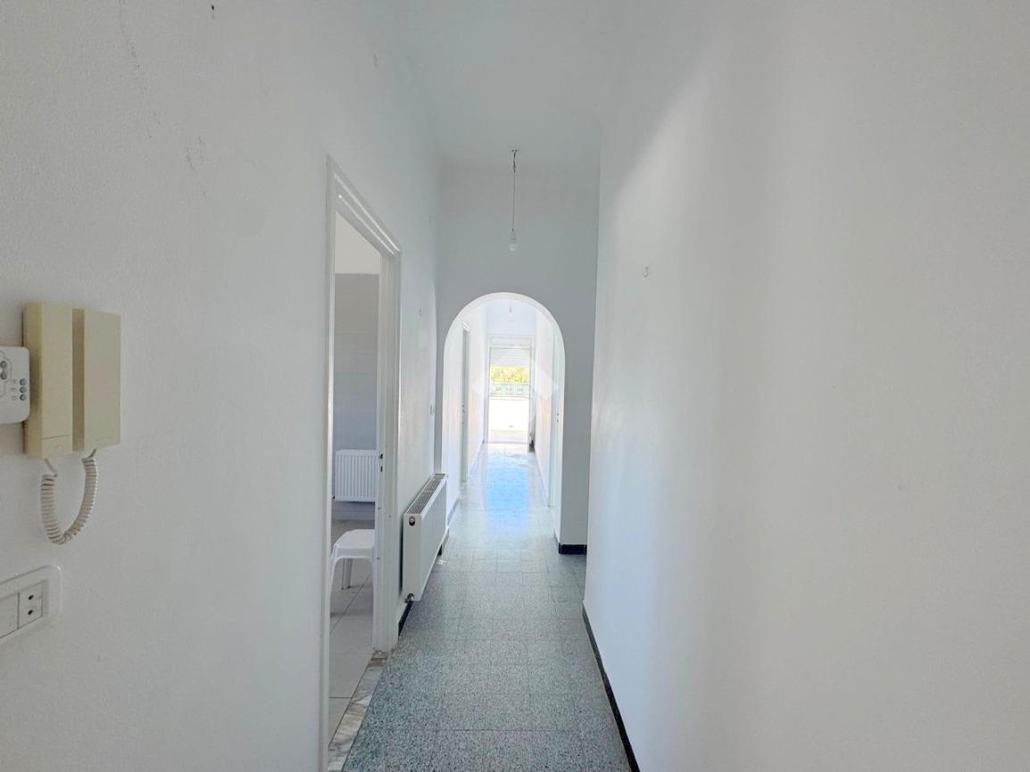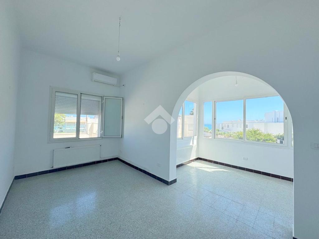Le hall d’entrée mène à un salon et une salle à manger lumineux, ouverts sur une terrasse bénéficiant d’une vue partielle sur la mer.