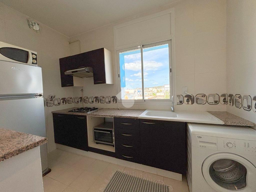 La cuisine est entièrement équipée : plaque de cuisson, hotte, four, réfrigérateur et machine à laver, avec de nombreux espaces de rangement pratiques.